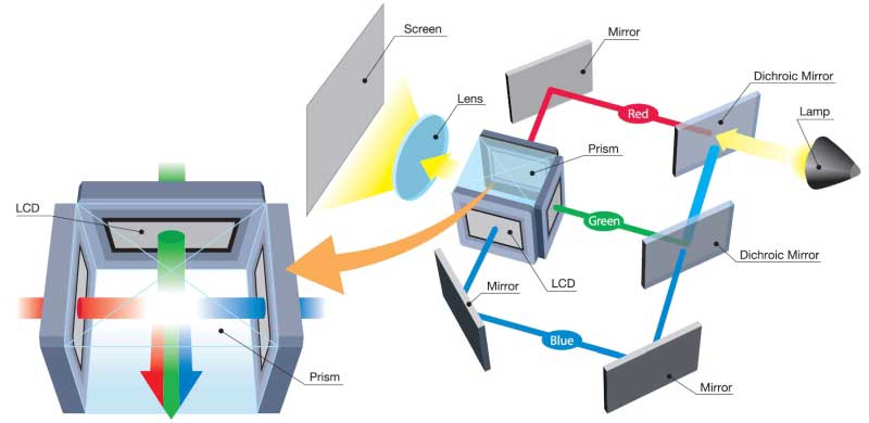 پروژکتورهای LCD یک منبع نور را از طریق پنلهای شفاف کریستال مایع میتابانند که پیکسلهای آنها میتوانند بهصورت جداگانه باز یا بسته شوند و سیگنال ویدیویی آنها را روشنتر یا تیرهتر کند. همانطور که اشاره شد، تراشههای تصویربرداری LCD جداگانه برای عناصر تصویر قرمز، سبز و آبی معمولاً استفاده میشوند، از این رو نام تجاری "3LCD" مرتبط با آنها است. چندین تولید کننده پروژکتورهای 3LCD را برای مشاغل، آموزش و سایر کاربردهای تجاری می سازند، اما ویدئو پروژکتور اپسون تنها برند اصلی فروش پروژکتورهای LCD برای سینمای خانگی است.
